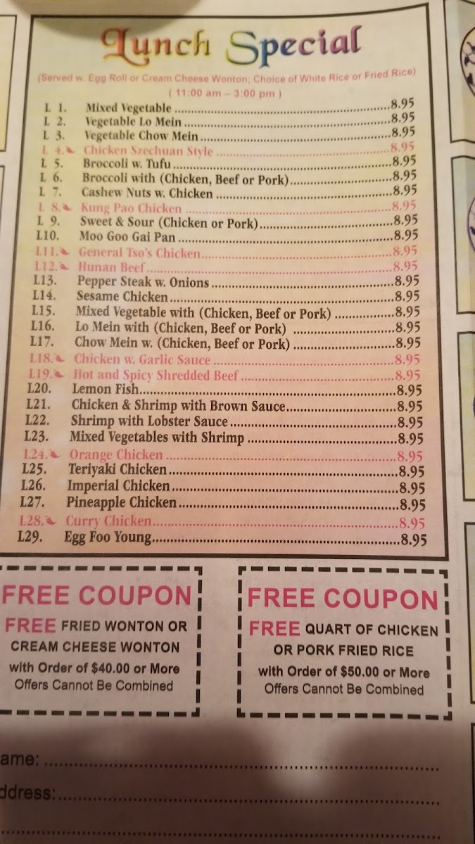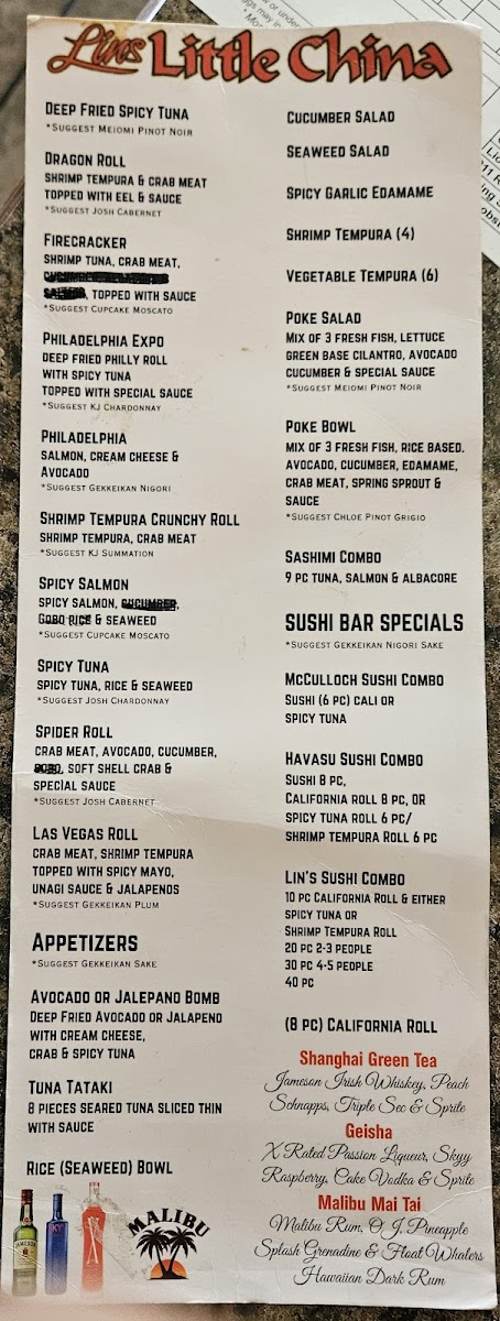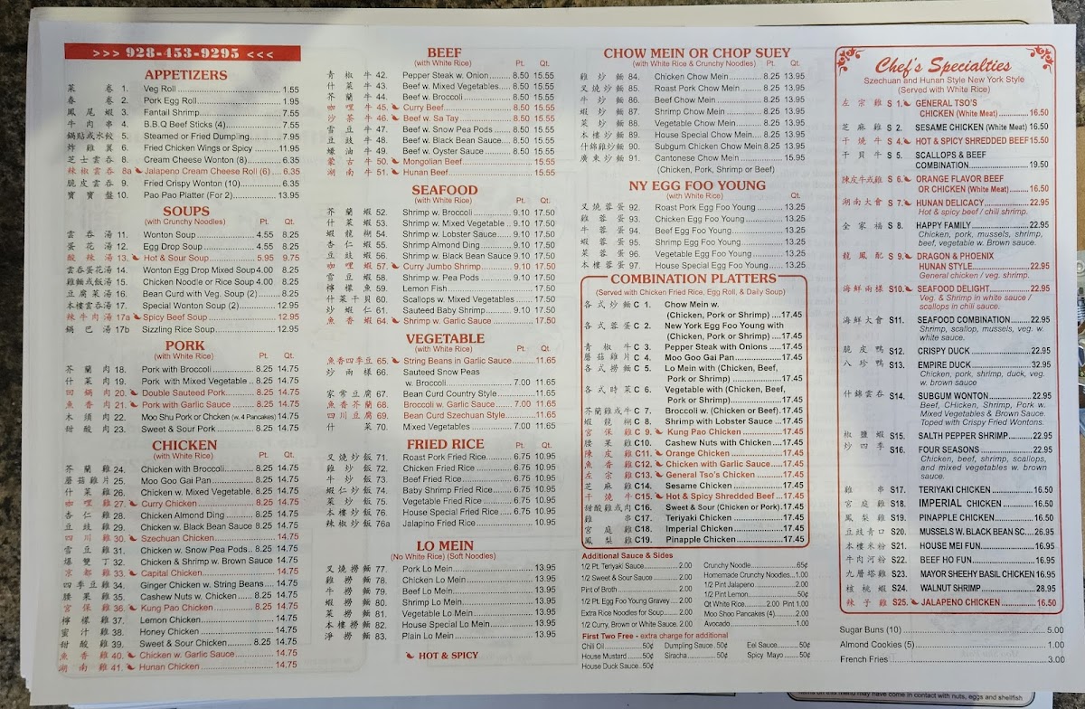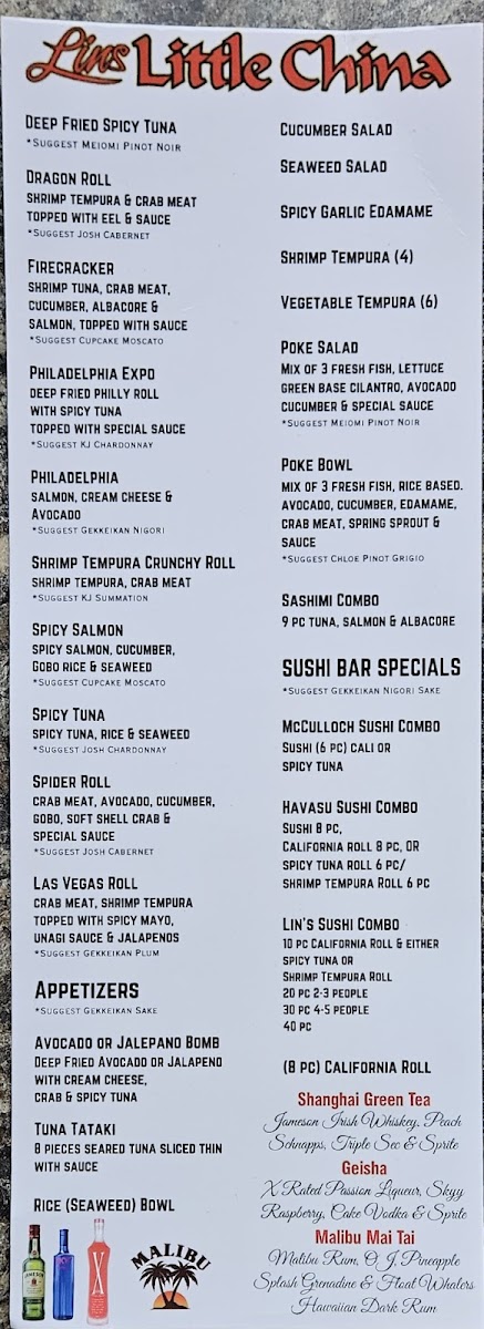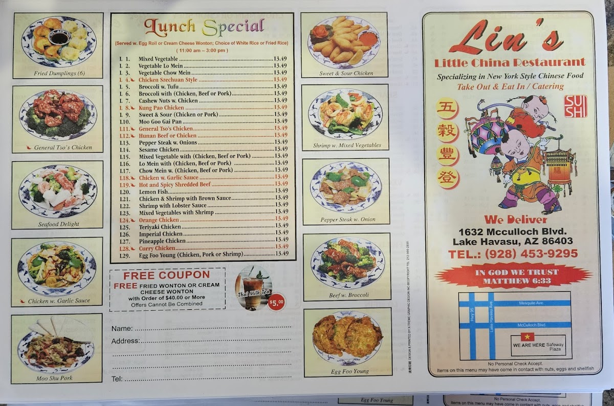 If you're craving delicious Chinese cuisine in the heart of Lake Havasu City, look no further than Lin's Little China Menu. Situated at 1632 McCulloch Blvd N, this cozy spot brings a taste of traditional flavors with a contemporary twist. Whether you're in the mood for savory noodles, flavorful stir-fries, or a comforting bowl of soup, there's something on the menu to satisfy every craving. The wide variety of dishes promises something for everyone, from classic favorites to unique creations that highlight the freshest ingredients. With each bite, you can expect a delightful balance of spices and seasonings, making every meal memorable. Lin's Little China invites you to explore their menu, where every dish is crafted with care and passion.